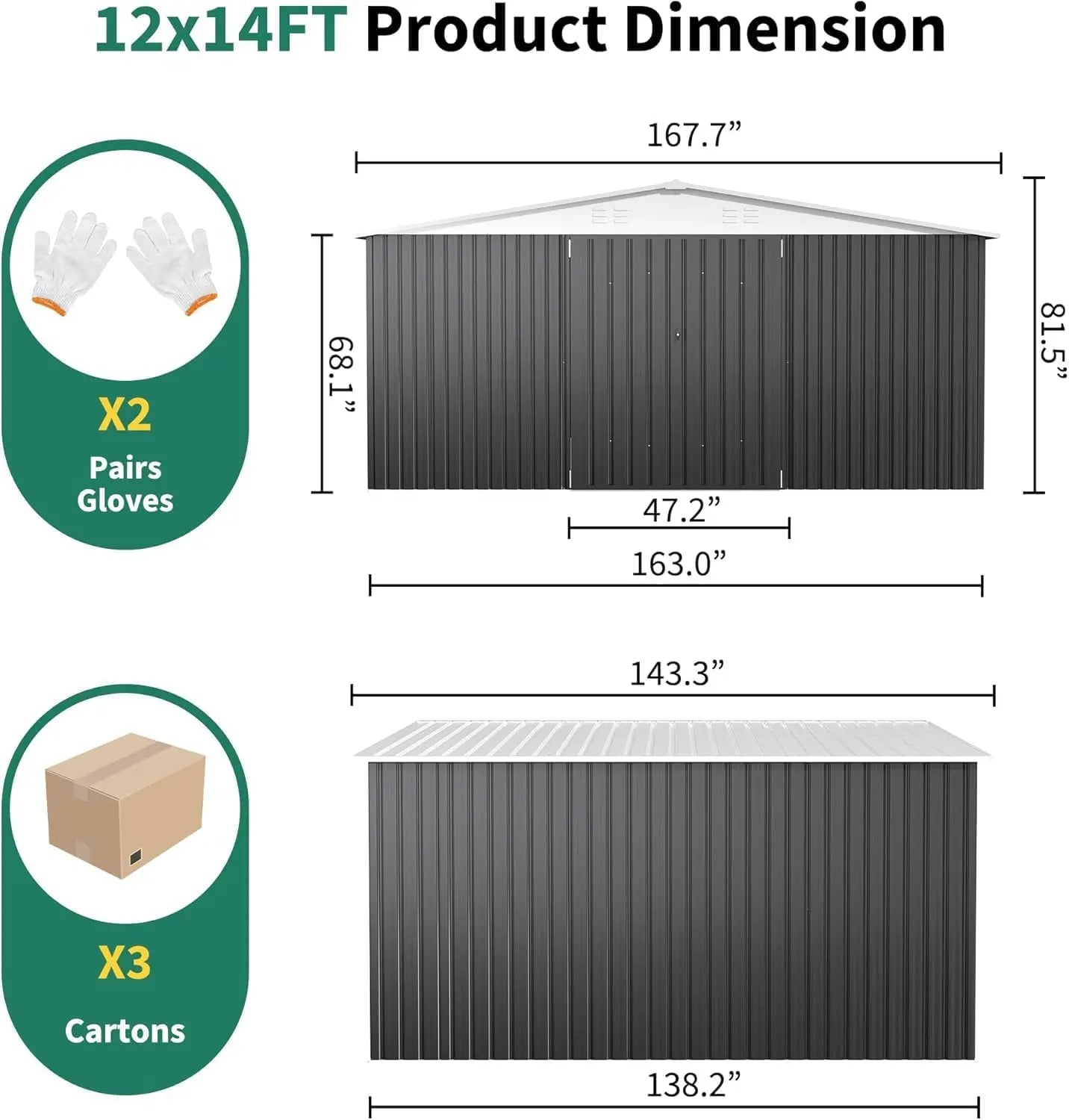 Spacious Storage Solution Measuring a generous 167.7"D x 138.5"W x 86.1"H, our shed offers ample space to house your gardening tools, equipment, and outdoor necessities without clutter.