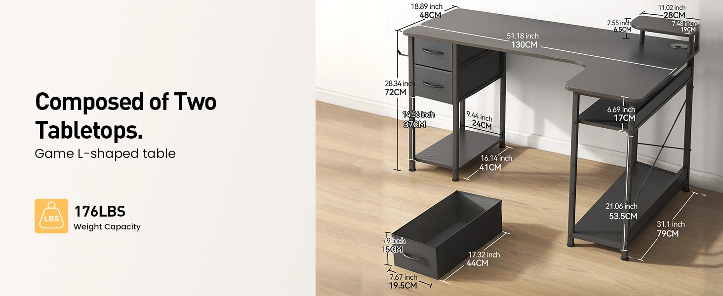 [stable and heavy-duty l-office desk]: the pc gaming desk top can hold up to 80kg, allowing you to safely set up your computer and peripherals.Reinforced pipes and cross braces prevent side-to-side wobbling, while durable spcc steel ensures strong stability.<br>