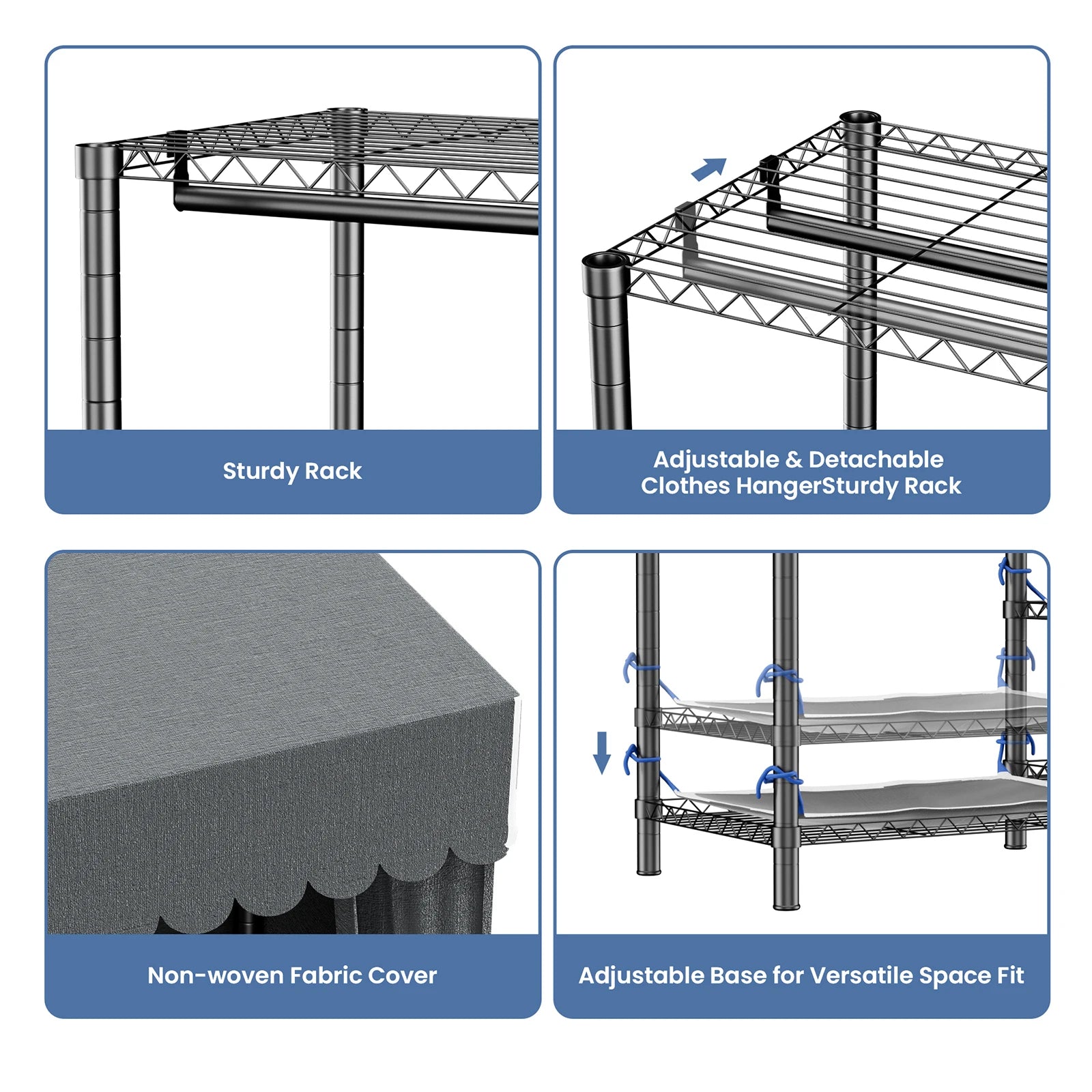DIY Storage Wardrobe with Gray Non-Woven Fabric Cover and Adjustable Bottom Height, Portable Freestanding Closet Organizer for Hanging Clothes
